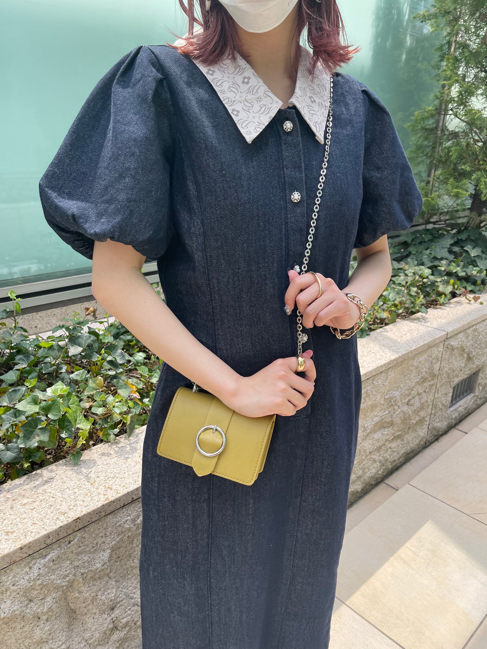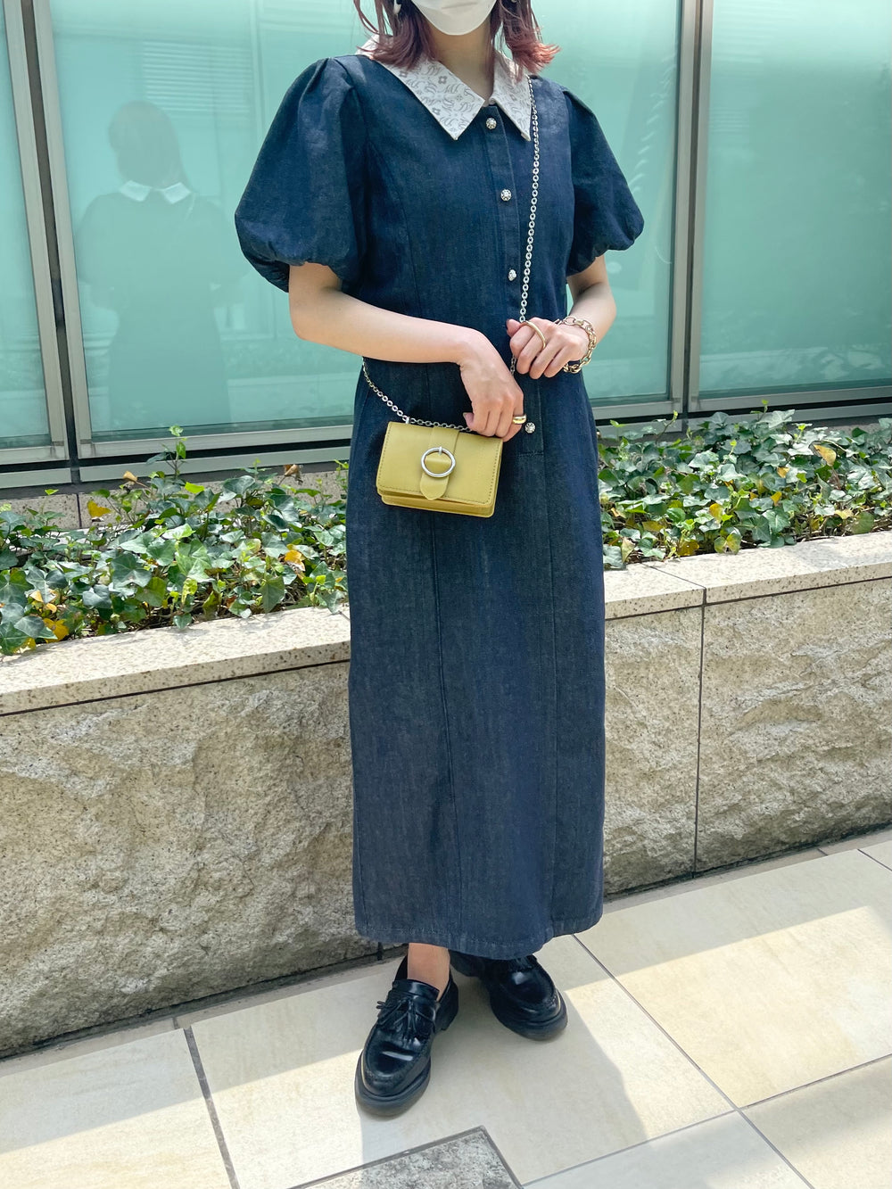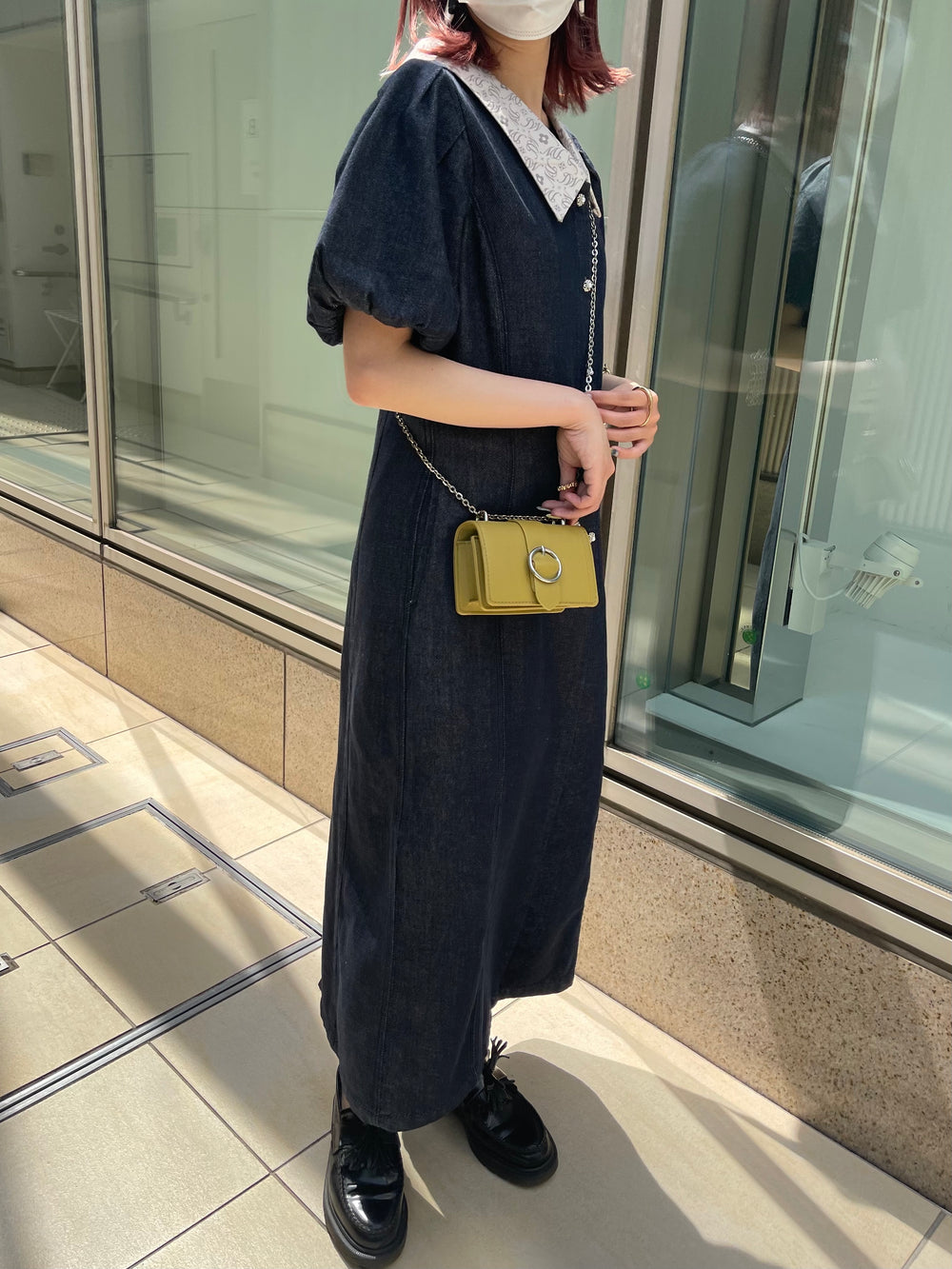 denim long one-pieceもカバンなどの小物で差し色を入れるだけで、