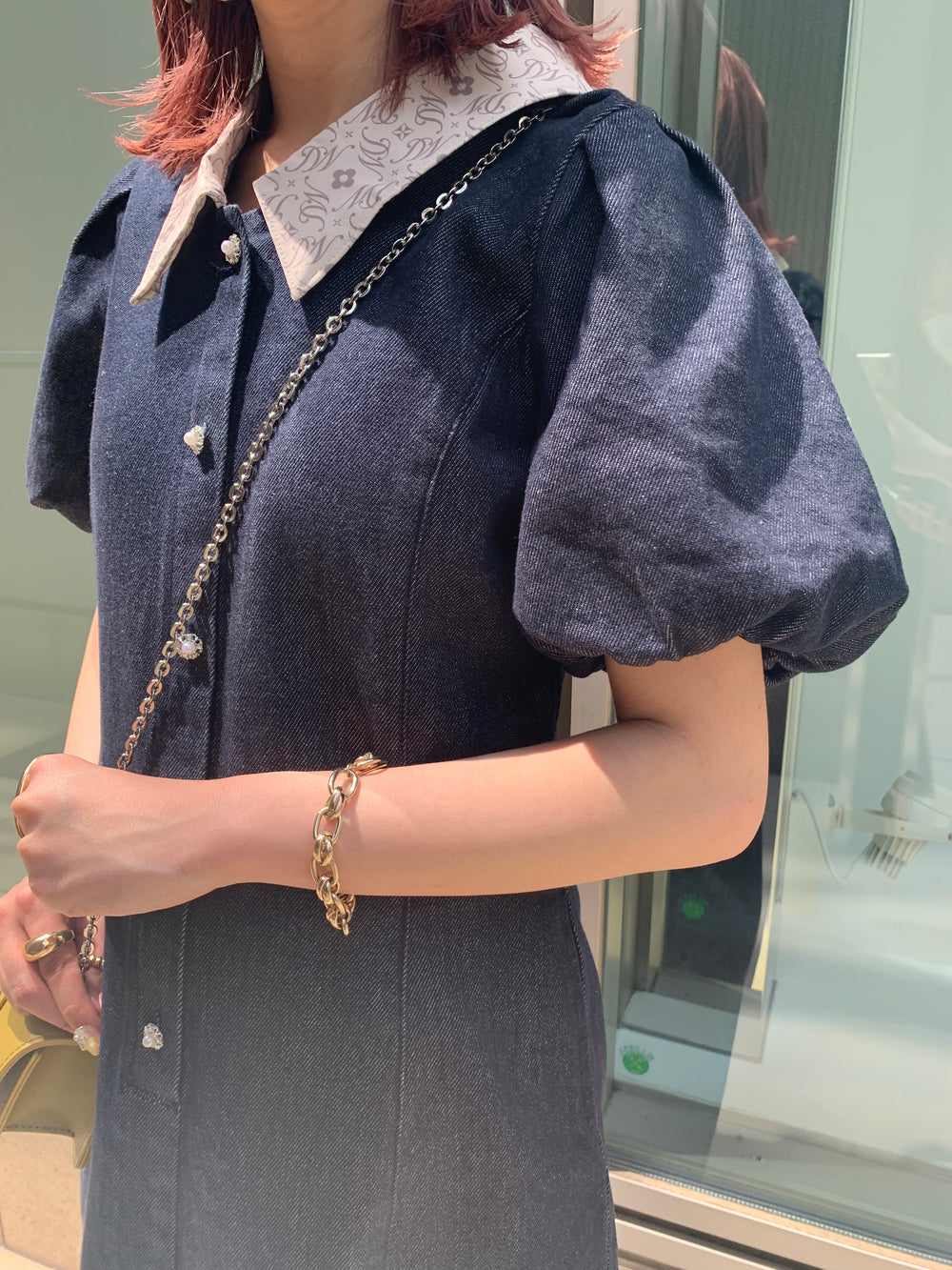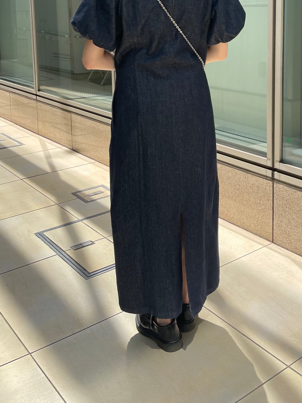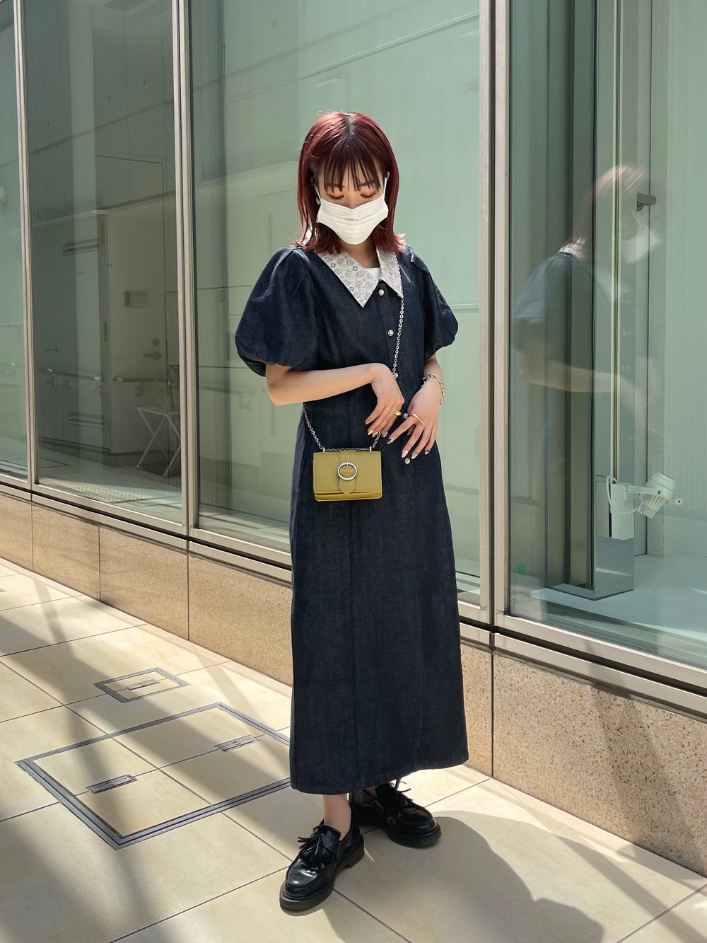 denim long one-pieceもカバンなどの小物で差し色を入れるだけで、